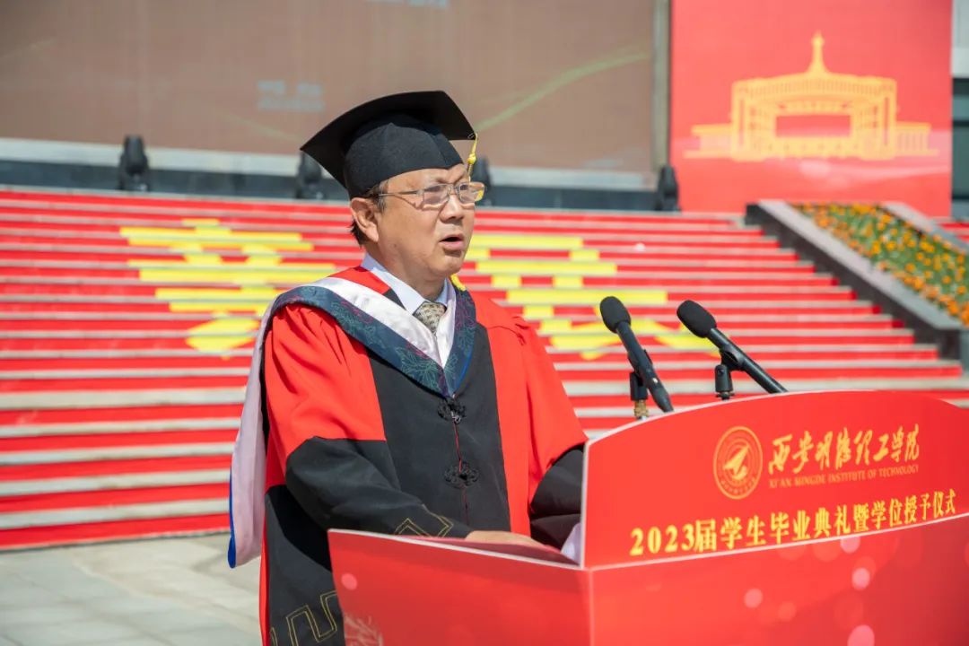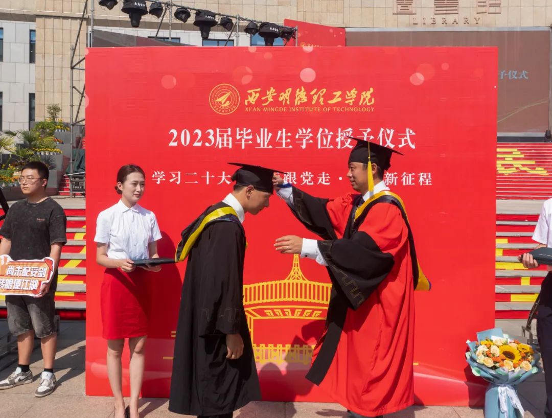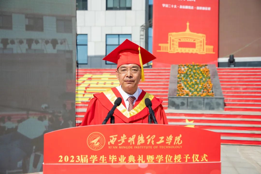 山高海阔再出发,策马逐梦赴未来。6月30日,2023届学生毕业典礼暨学位授予仪式在学校中心广场隆重举行,金叶科教集团董事局主席、总裁,明德源教育集团董事长、总裁,学校董事长袁汉源,学校校长杨健君,党委书记阎东明,明德源教育集团助理总裁张琳,学校常务副校长王志刚、副校长刘星,财务总监马晓军以及学校学位评定委员会成员,各二级学院领导班子,各职能部门负责人,校友代表,毕业班辅导员老师、毕业生家长代表,全体毕业班学生参加典礼。典礼由学校党委副书记董昊主持。