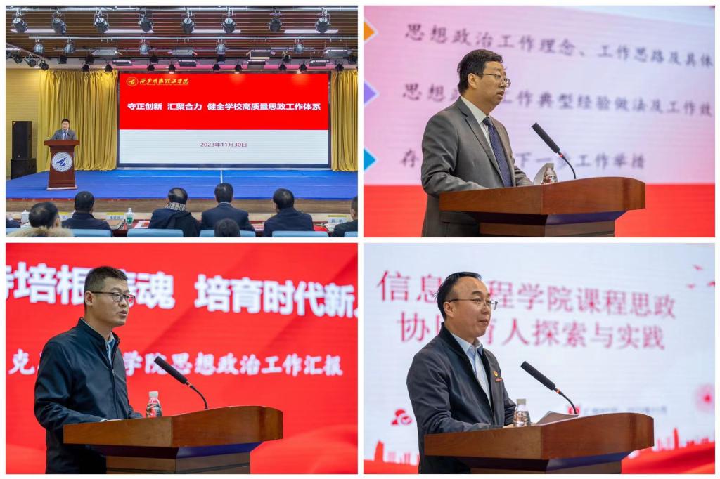会上,党委组织宣传部通报了学校思想政治工作有关文件讨论和征求意见情况,并就健全完善学校思想政治工作体系、提升思想政治工作质量作了专题汇报。教务处、马克思主义学院、信息工程学院分别围绕发挥课堂教学主渠道作用、思想政治理论课建设、课程思政等内容,从思政工作的经验做法、取得的成绩、存在的问题及下一步工作思路等方面进行了经验分享和交流发言。