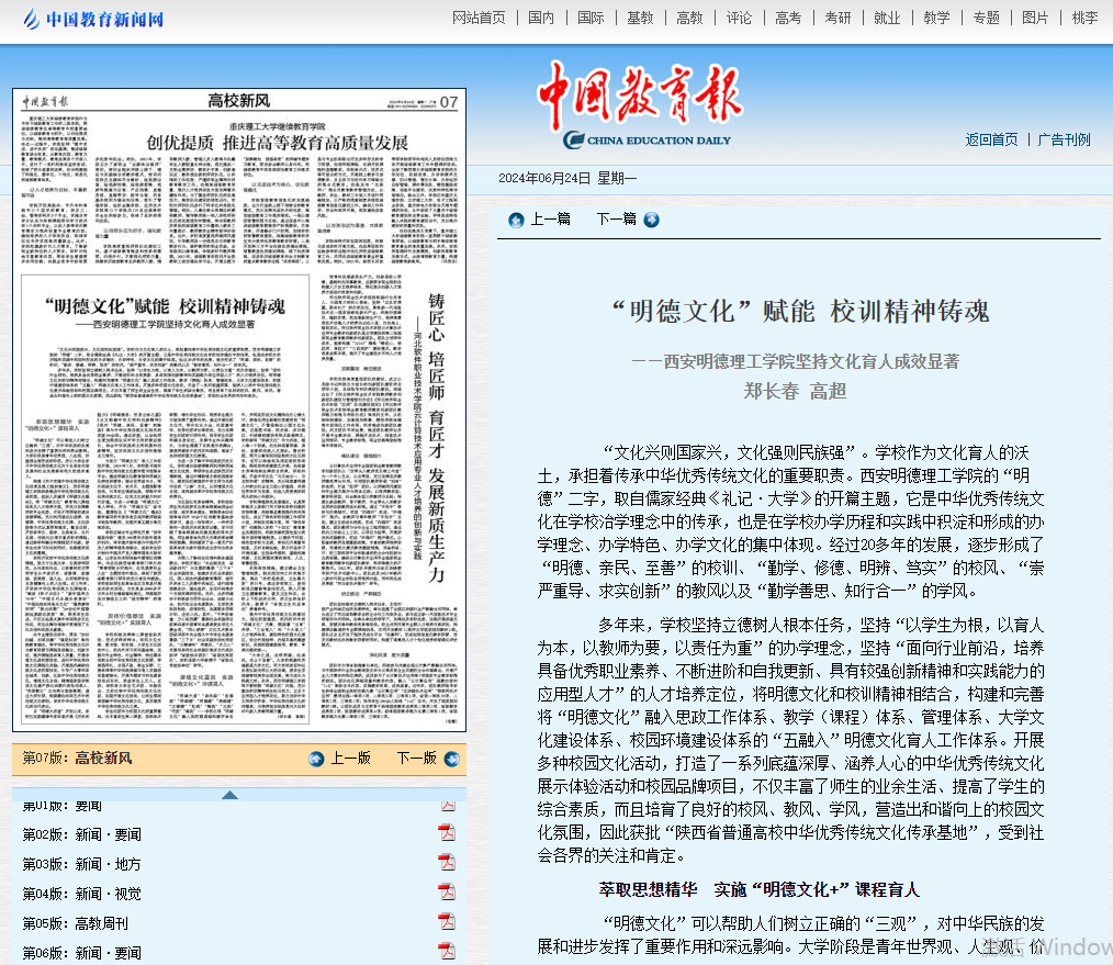 6月24日,《中国教育报》第七版(高校新风)以《“明德文化”赋能 校训精神铸魂——LETOU国际米兰官网坚持文化育人成效显著》为题,报道LETOU官网文化育人工作。