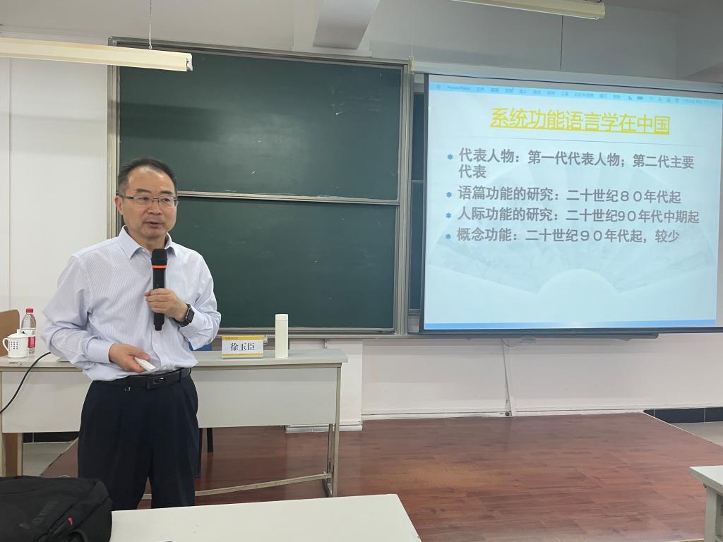 7月2日下午,在培德楼201,西安外国语大学外国语言文学研究中心教授、博士、博士研究生导师,中国英汉语比较研究会系统功能语言学专业委员会常务理事、中国英汉语比较研究会英汉语篇分析专业委员会常务理事、陕西高校大学外语教学研究会副会长、陕西省翻译协会常务理事徐玉臣为语言文化传播学院教师做了题为“课题申报及研究漫谈——以英汉科技语篇中语言评价系统对比研究为例”的学术报告。报告会由语言文化传播学院副院长刘勇教授主持。