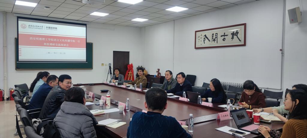 座谈会上,西安电子科技大学外国语学院执行院长马刚对我们的到访表示欢迎,教学副院长李长安介绍了外国语学院的发展历史和基本情况,随后我院院长马庆林就本次到访调研内容进行了简单的介绍,双方就本科翻译专业、英语专业、大学英语的课程设置、人才培养、实习实践等几方面开展了细致地讨论和交流。