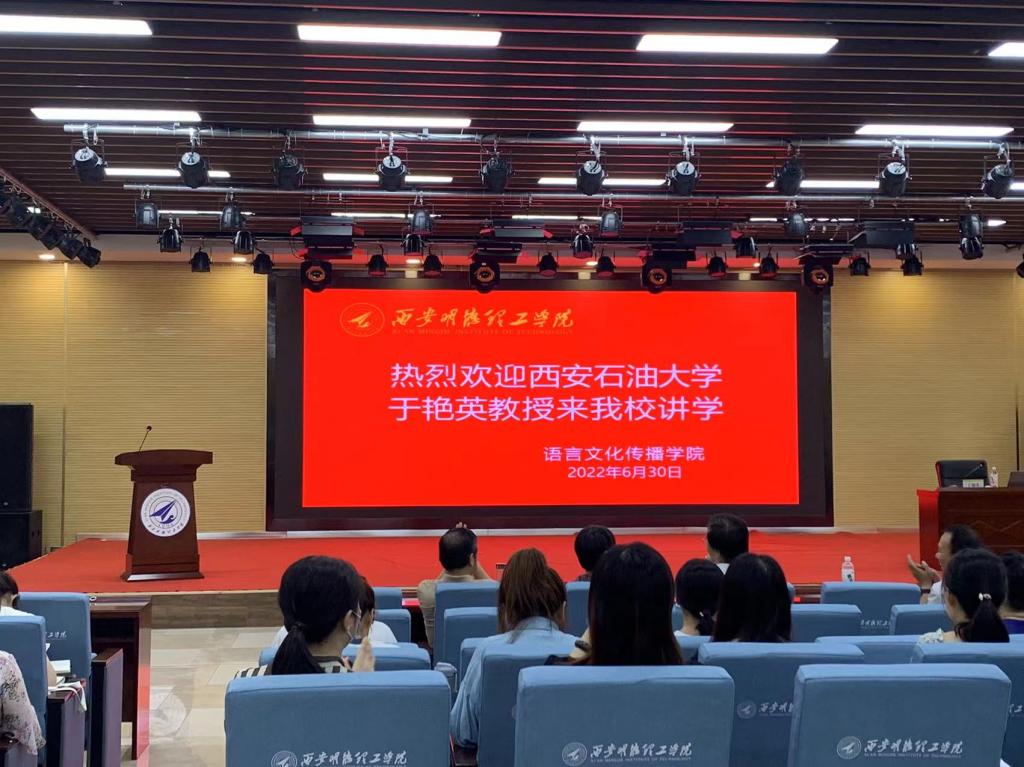 6月30日下午2点30分,在6号楼203会议室西安石油大学于艳英教授来我院讲学,讲座由语言文化传播学院副院长刘勇主持,院长马庆林和全院教职工参加讲座。