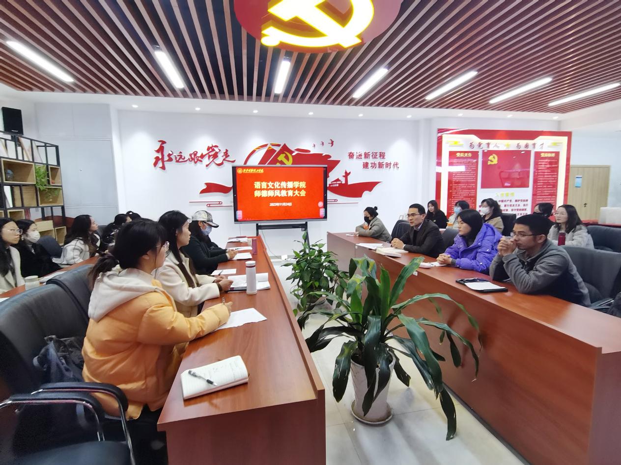 11月24日下午,语言文化传播学院在明志楼北108党群活动中心召开师德师风教育大会。学院2023年新入职的教职工参会。会议由学院党委书记赵旭东主持。