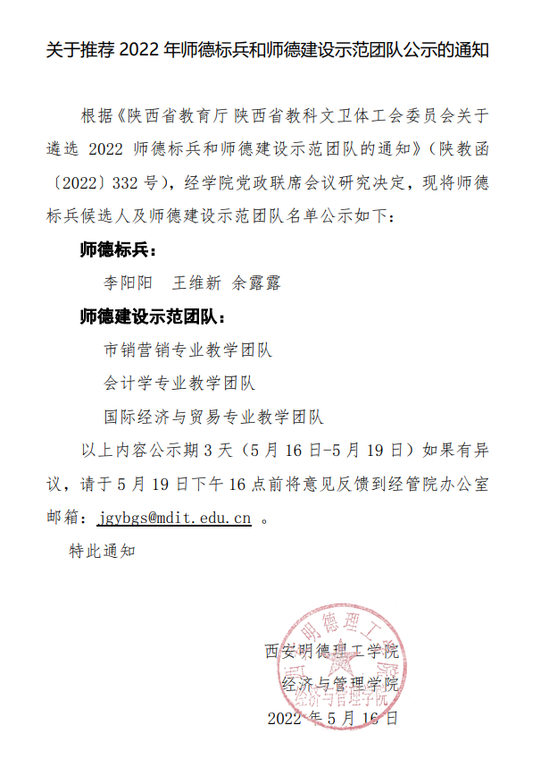 关于推荐2022年师德标兵和师德建设示范团队公示的通知 2022-05-16 14:58:56
