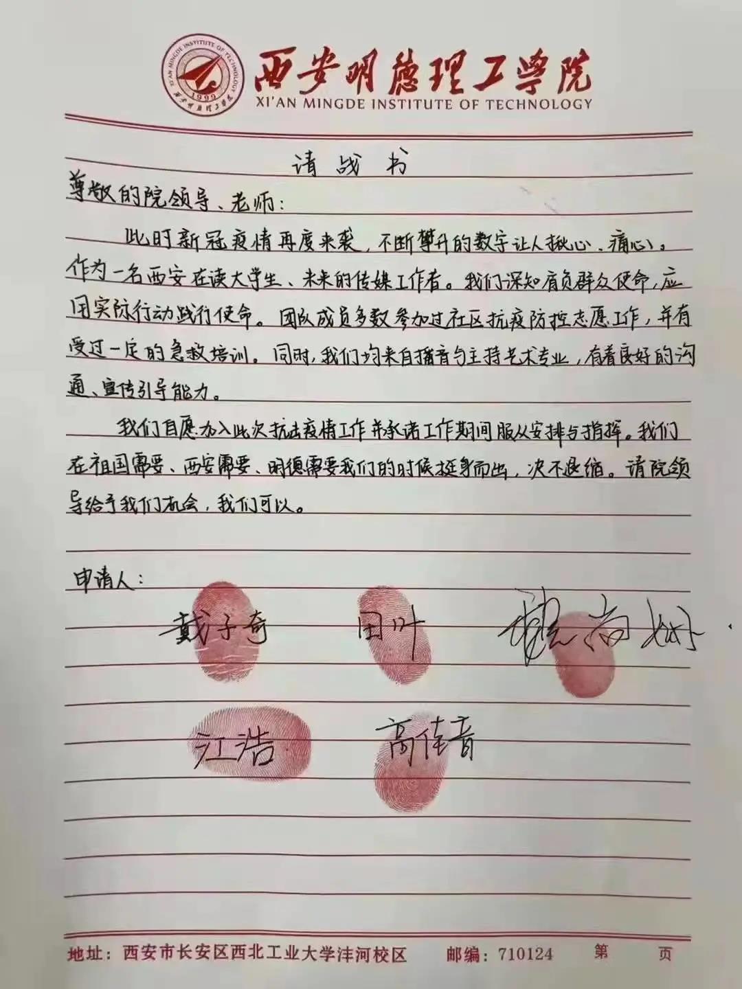 2021年12月末,西安正在接受着疫情重重考验,一群在外求学的西安学子也同样正在接受着疫情的考验!一封封充满热血的请战书也代表了LETOU国际米兰官网艺术与设计学院莘莘学子同心抗疫的决心与勇气。