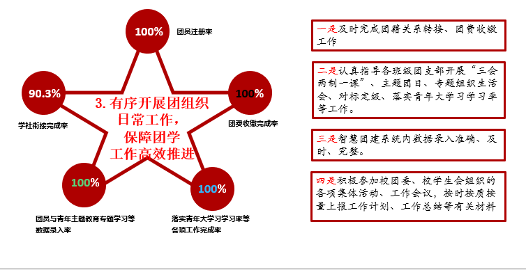 3.有序开展团组织日常工作,保障团学工作高效推进。一是及时完成团籍关系转接、团费收缴工作。全年共录入团员589人,团员注册率100%,团干团员信息录入准确无误,转出团组织关系709人,学社衔接完成率90.3%,团费收缴完成率100%。二是认真指导各班级团支部开展“三会两制一课”、主题团日、专题组织生活会、对标定级、落实青年大学习学习率等工作。各项工作完成率均为100%。三是智慧团建系统内数据录入准确、及时、完整。党的二十大精神学习、组织生活会、团员与青年主题教育专题学习、对标定级等数据录入率均为100%。四是积极参加校团委、校学生会组织的各项集体活动、工作会议,按时按质按量上报工作计划、工作总结等有关材料。