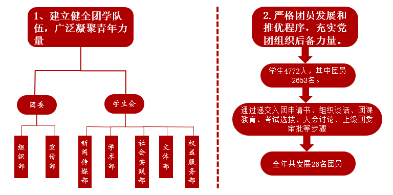 1.建立健全团学队伍,广泛凝聚青年力量。我院团委在履行好团章规定的职责外,侧重于团的建设和团干部培养,经过优化重组,团委现设有团委书记一名、学生兼职副书记一名,下设组织部、宣传部两个部门,现有部门负责人6人,志愿者47名,学生会现有主席团成员三名、下设新闻传媒部、学术部、社会实践部、文体部、权益服务部五个部门,现有部门负责人10人,志愿者70名。