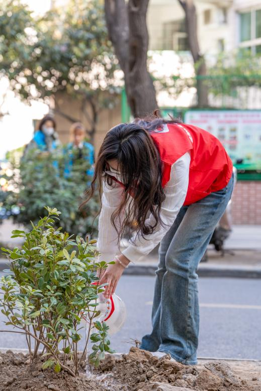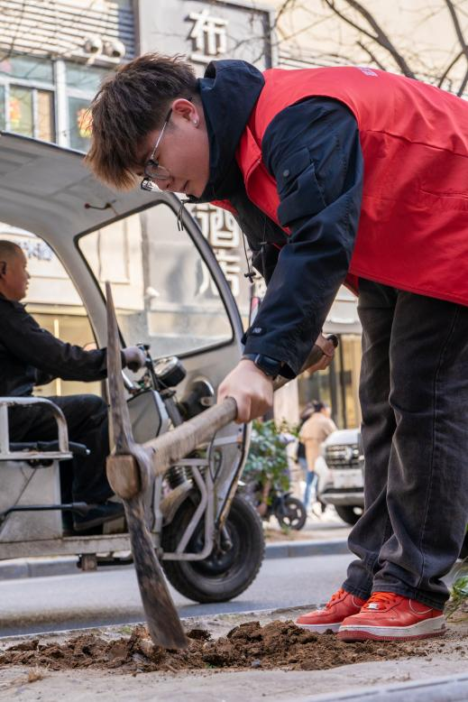 在学生党支部书记的带领和社区工作人员的指导下,我院学生热情高涨、干劲十足,大家分工明确,齐心协力,撸起袖子加油干,共同完成挖坑、栽种树苗、填土、浇水等步骤,在相互帮助、不断实践中高效的完成栽种树苗的任务,呈现出一派热火朝天的劳动场面。