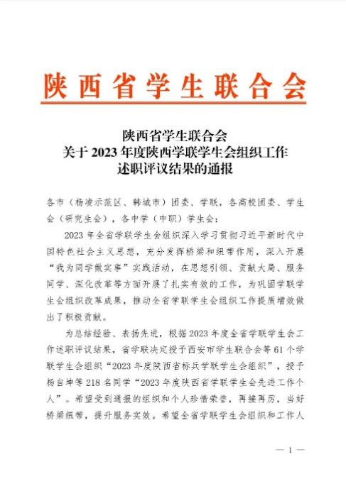 根据陕西省学生联合会下发《关于2023年度陕西学联学生会组织工作述职评议结果的通报》,我院学生吕梦菲荣获“2023年度陕西省学联学生会先进工作个人”称号。
