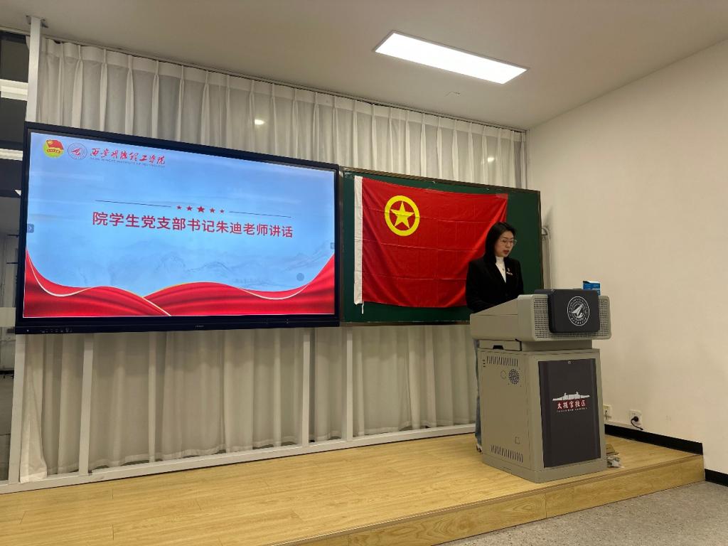 学院学生党支部书记朱迪老师发表了讲话。她强调,入团是对党和组织忠诚的体现,成为共产主义青年团的一员也就要清楚党的助手和后备军身份,要保持坚定信仰,永远听党话、跟党走。作为能通过团组织层层考验和选拔的新发展团员,此刻并非终点而是起点,入团是对集体的承诺,要承担更多的责任与义务,要用实际行动践行党的理想和宗旨,在青年学生群体中当好党的理论价值发声人和带头人,努力做一名合格的共青团员,最后代表学生党支部勉励新团员在大学期间,与志同道合的同学共同奋斗,期盼各位以实际行动早日通过党组织的考验。