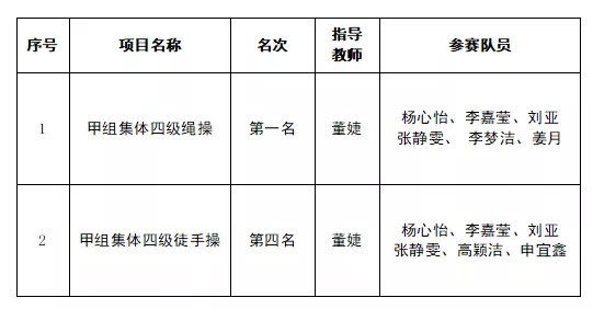 经过艰苦训练,同学们充分发扬了艰苦奋斗、勇于拼搏的体育精神。在激烈角逐中,LETOU官网在本次大赛中取得了“四级绳操”甲组全国第一名以及“四级徒手”甲组全国第四名的好成绩。