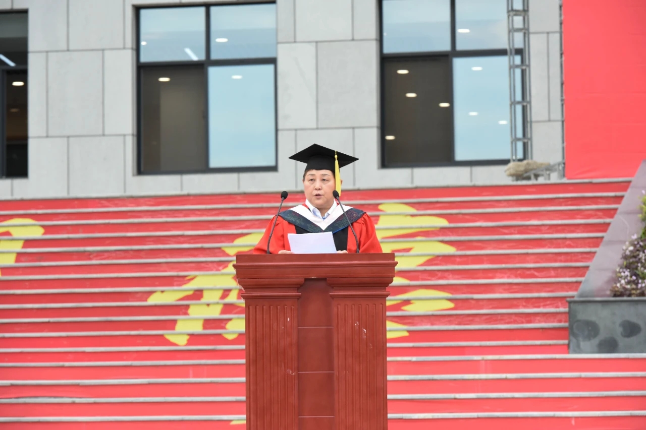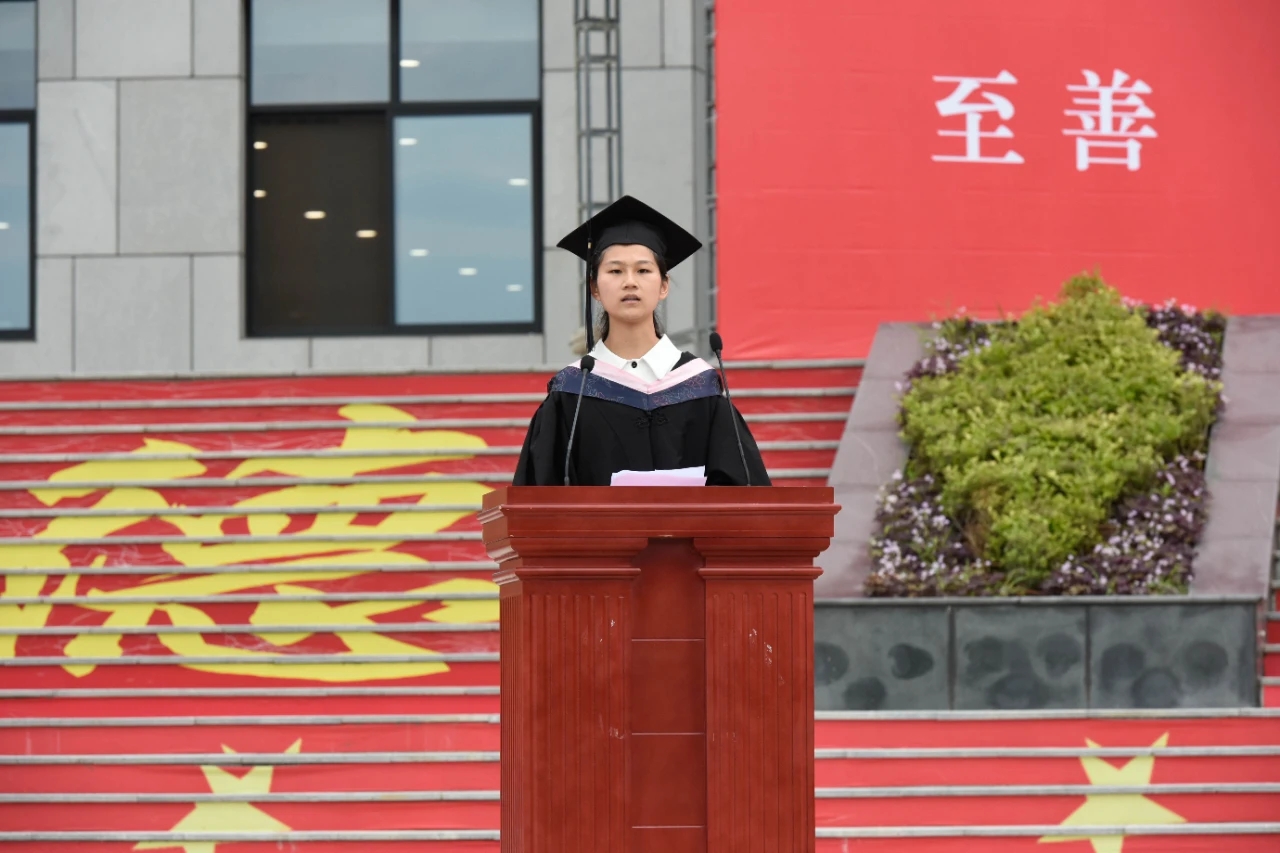 毕业生代表冯岩同学发言,她回顾了自己奋斗成长的历程,感谢母校的培养、老师的教诲和同学们的陪伴,并表示在新的岗位上会为母校增光添彩。
