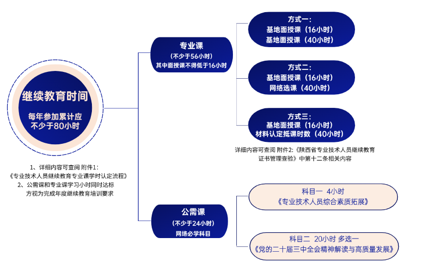 按照要求,参加培训人员每年参加继续教育时间累计应不少于80小时,其中公需课不少于24小时,专业课不少于56小时,公需课和专业课学习学时同时达标方视为完成年度继续教育培训要求,请自行注册学习。