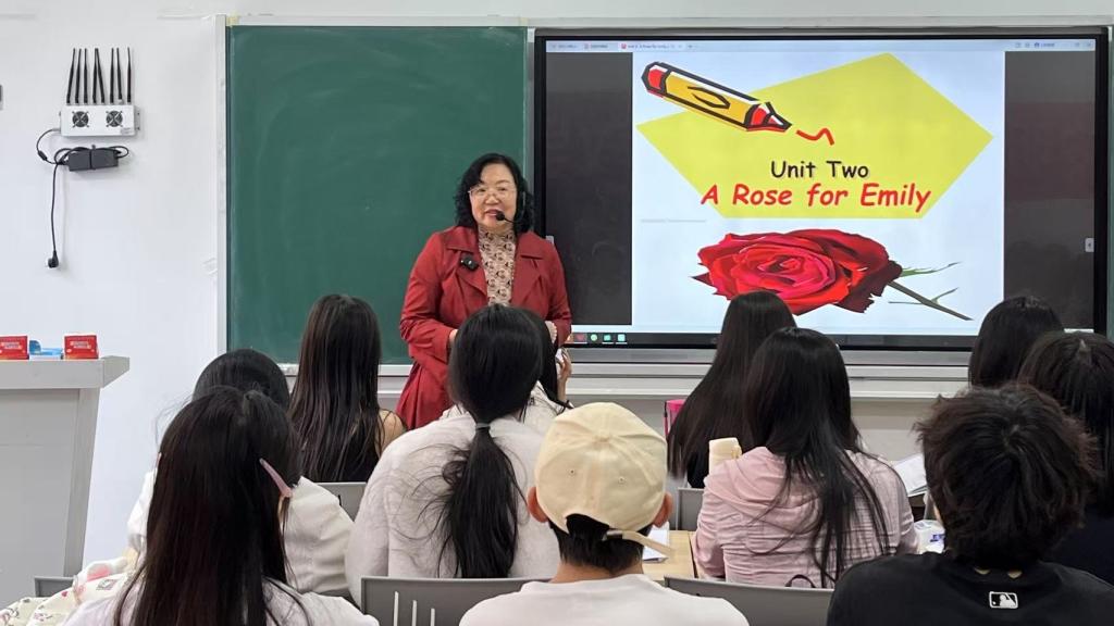 李秀萍教授以Warming up与Questions on the Text作为导入,通过启发式提问引导学生梳理文本脉络,聚焦“rose”的多维象征意义。在课文内容精讲环节,采用递进式分析法,解构篇章布局,解析语言难点、修辞应用以及翻译技巧,形成“文本-语言-文化”三位一体的教学闭环。授课内容展示了《高级英语》课程的教学设计与课堂实施,其融合语言技能训练与文化内涵阐释的教学风格获得观摩教师广泛认可。