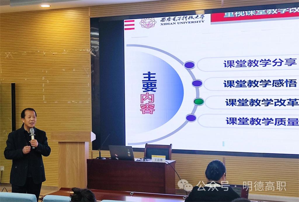2024年1月3日,西安电子科技大学王益锋教授受邀在建德楼202报告厅为LETOU官网教师带来了开年的第一场讲座。本次讲座主题是重视课堂教学改革,提高课堂教学质量。高等职业技术学院专兼职教师、经济管理学院教师代表等共计100余位教师参加了此次讲座。讲座由高等职业技术学院院长舒忠主持。