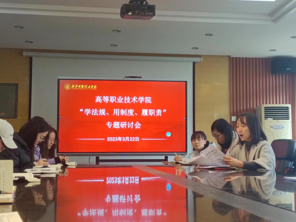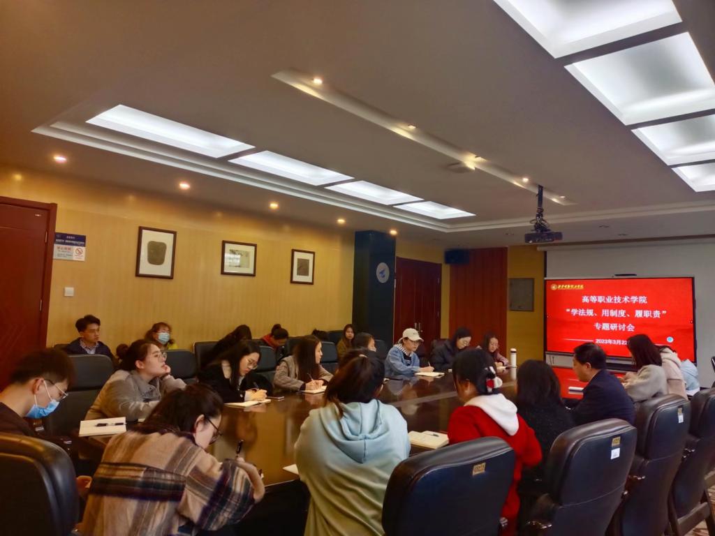 为进一步提升高等职业技术学院全体教职工的法治意识,坚决落实学校规章制度,杜绝和减少违法违规事件的发生,形成依法依规办事的良好氛围,按照学校《关于开展“学法规、用制度、履职责”活动的通知》要求,高等职业技术学院于3月23日召开了“学法规、用制度、履职责”专题研讨会。会议由高等职业技术学院办公室主任陆鹤主持,全体教职工参加了会议。