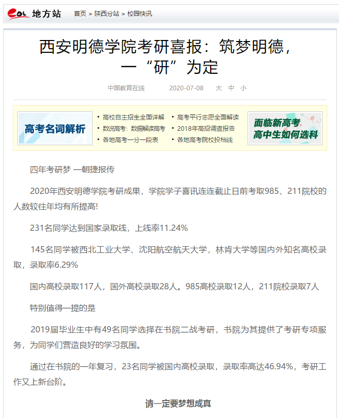 中国教育在线等多家官方媒体报道我院2020年考研学生录取情况