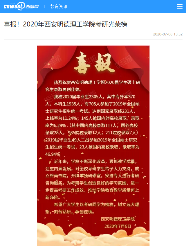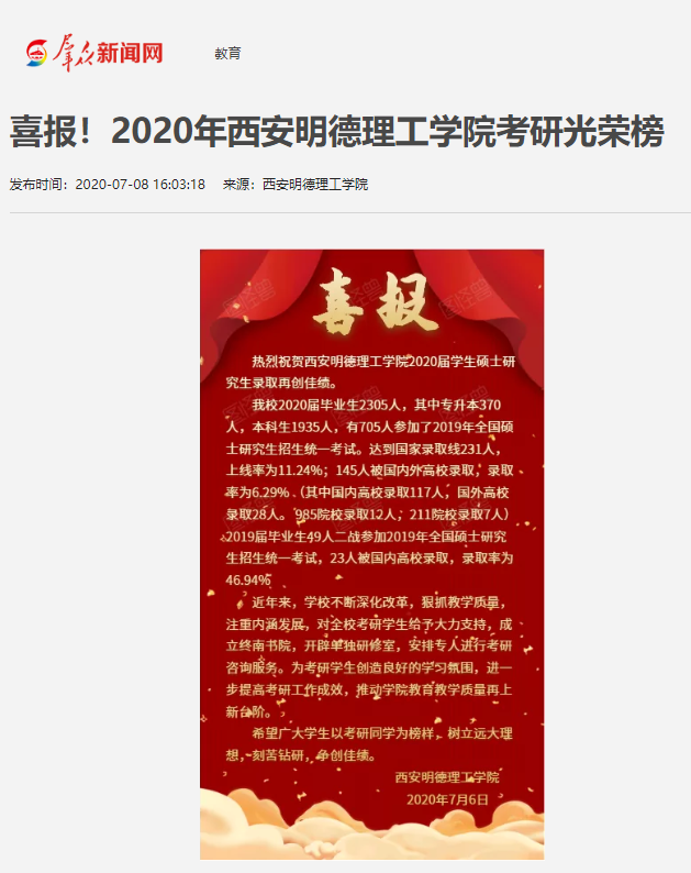 这一喜讯受到了社会各界关注,中国教育在线、新浪陕西等多家媒体相继报道。截至发稿日期,关于我院考研喜报的讯息,在各平台浏览及播放总量已达数百万余次。