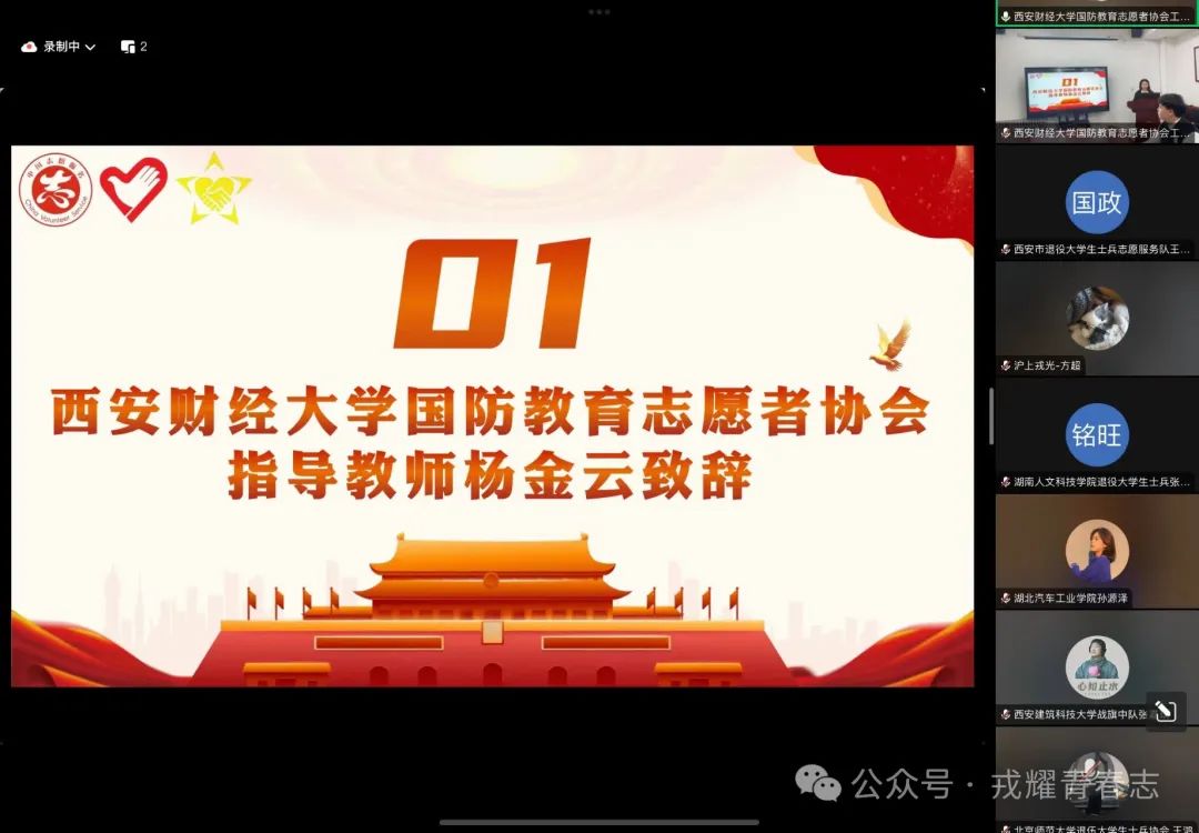 本次交流会由西安市退役军人服务中心、西安财经大学人武部精心指导,西安市退役大学生士兵红十字“三献”志愿服务队主办,西安财经大学国防教育志愿者协会承办。通过线上线下相结合的创新方式,打破了地域限制,让更多的志愿服务力量得以汇聚。