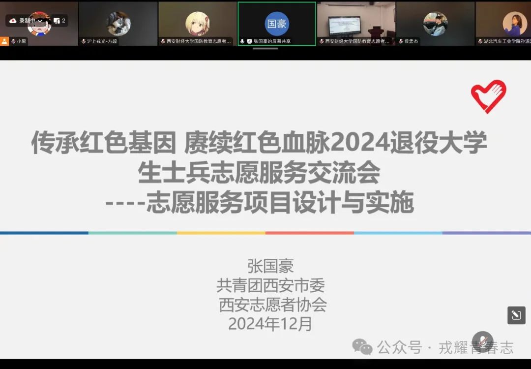 “沪上戎光”上海市高校退役大学生联盟志愿服务队负责人方超也代表参会组织发言,他对各组织单位的精心策划表示感谢,并期望通过此次交流分享,让战友们在今后的志愿服务活动中更加积极主动,使退役军人志愿服务项目更具活力和新意。