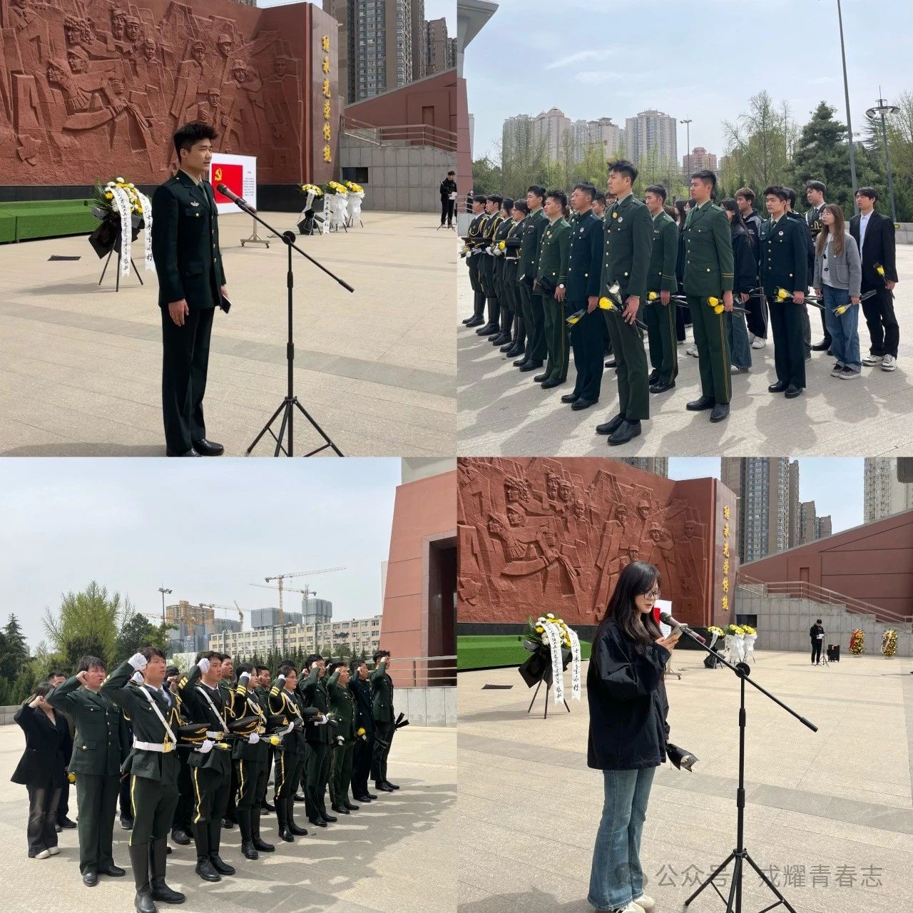 退役大学生士兵代表、戎耀社团荣誉成员率先发言。他轻抚着军装,讲述服役时班长讲述的烈士故事:“当年先烈用胸膛堵枪眼,今天我们以脊梁承使命。这身褪色的军装,永远是连接战火青春与和平年代的纽带。”发言尾声,他与社团成员共同举起右拳,面向纪念碑重诵入伍誓词,铿锵之声惊起松枝露珠,似先烈洒落的欣慰泪光。