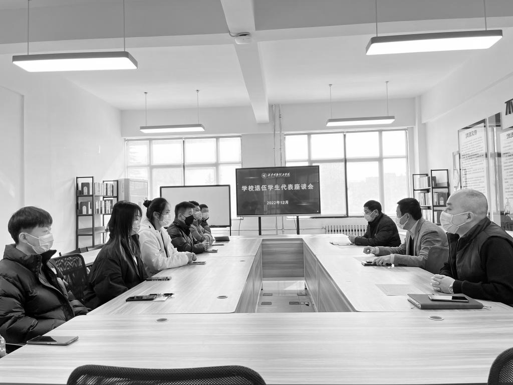 12月2日中午,学校退伍学生代表座谈会在明志楼南306会议室举行。学校党委副书记董昊,人武部部长童杨梓参加会议。座谈会由学校征兵工作站站长李传斌主持。
