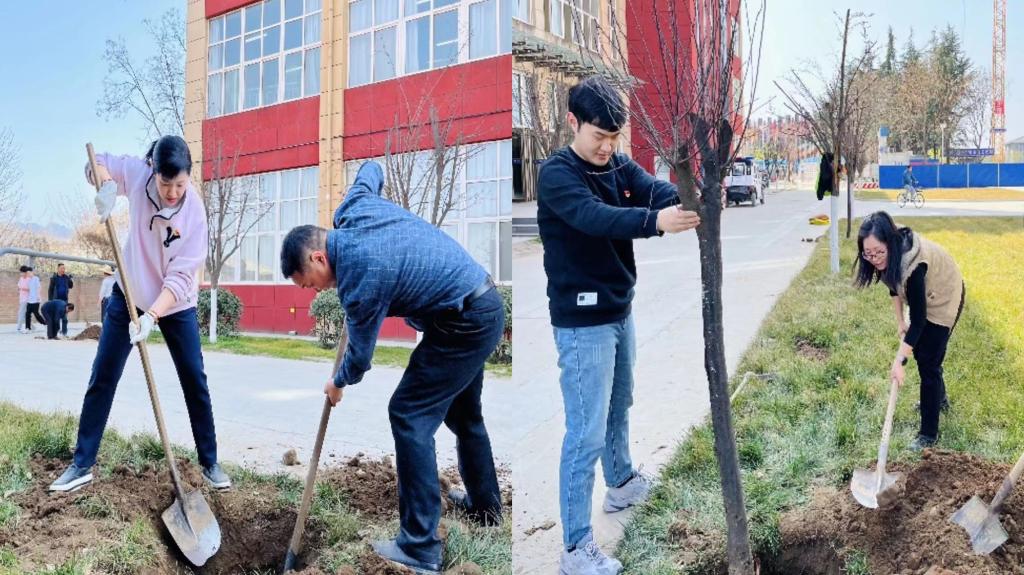 在植树活动现场,大家热情高涨、干劲十足、分工协作、同心协力,有的挥锹铲土,有的扶苗填坑,有的踏土夯实,以极大的热情投入到植树活动中。