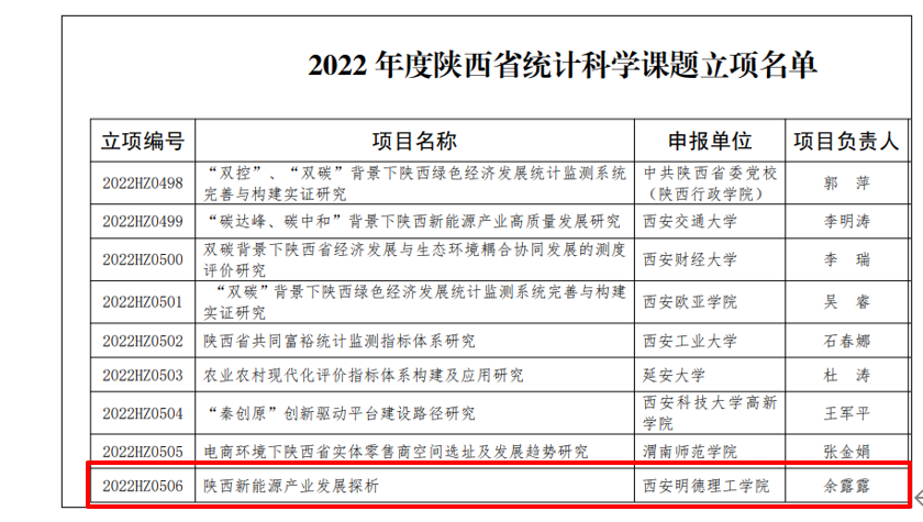 5月9日,陕西省社会科学界联合会下发“关于公布2022年度陕西省统计科学课题立项结果的通知”,我院余露露老师的“陕西新能源产业发展探析”课题(立项编号:2022HZ0506)获批2022年度陕西省统计科学一般课题。