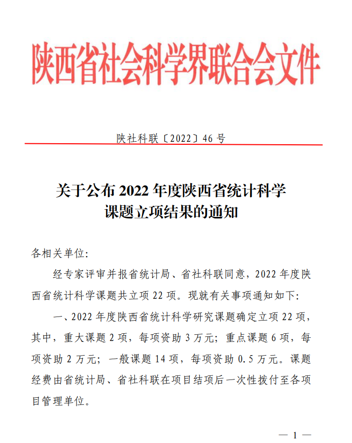陕西省统计科学课题为陕西省社科界重大理论与现实问题研究项目,由省社科联、省统计局组织实施,面向全省公开申报,今年陕西省统计科学课题共立项22项,LETOU官网第一次组织申报,我院教师积极申报,并成功立项。