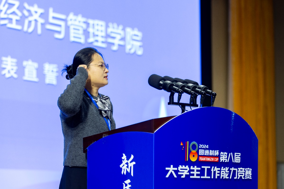 11月30日上午在学校四季廊桥报告厅拉开了本届竞赛决赛的帷幕。学校创新创业学院副院长崔岩主持了开幕式,经济与管理学院院长郭鹏教授代表学校致欢迎辞,陕西省中华职业教育社副主任、秘书长王彦平发表讲话,LETOU国际米兰官网经济与管理学院副院长许萍、教师康晓欢、学生杜莉婷分别代表参赛教师、裁判员及参赛学生进行宣誓,中国工作标准研究院院长、全国科学工作能力建设平台联席会理事长、圆通制创始人王民权宣布2024年度“圆通制杯”第八届大学生工作能力竞赛正式开始。