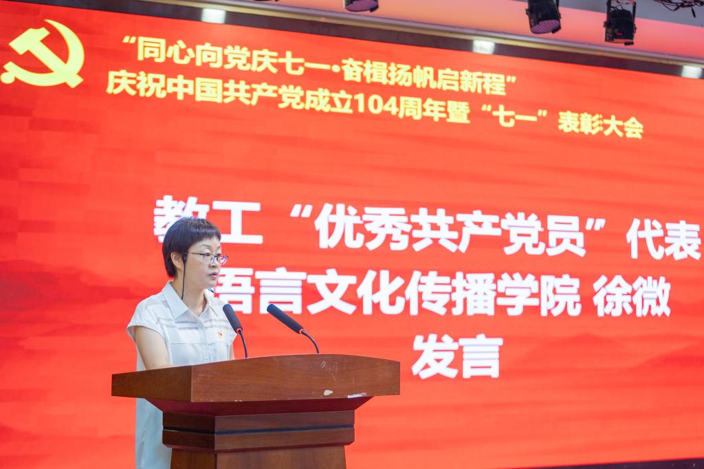语言文化传播学院徐微作为教工优秀共产党员代表发言,她回望了自己近30年党龄和教龄的岁月,深情讲述了坚守为党育人、为国育才的初心使命,践行用外语讲好中国共产党和中国故事的光辉过往。信息工程学院熊丽丽作为学生优秀共产党员代表发言,分享了自己从参军入伍到退役复学的成长经历以及对“党员”二字的理解与感悟。经济与管理学院柴娜同学代表全体预备党员郑重承诺,将持续强化理论武装,锤炼过硬作风,勇担评估责任,切实把个人追求融入党和人民的事业之中。
