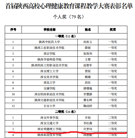 为积极响应和落实《中共陕西省委教育工委办公室关于开展首届陕西高校心理健康教育课程教学大赛的通知》精神,通识教育学院认真组织院内专兼职心理健康教育教师,于2020年10月13日进行了教学大赛初选,最终推选许梦珂老师代表学院参加陕西省高校心理健康教育课程教学大赛现场展示环节。2020年11月9日,省级现场展示环节在西安美术学院进行, 共有 79 名心理健康专兼职教师参赛。最终经过激烈角逐,共评出一等奖 12人,二等奖24人, 三等奖43 人。我院许梦珂老师不负众望,斩获大赛二等奖。