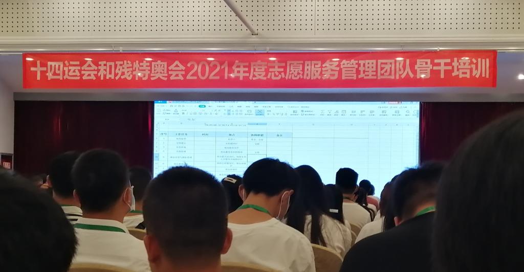 培训主要学习了:《观众服务场馆运行工作介绍》、《四十运会和残特奥会赛会志愿者层级管理》、《十四运会和残特奥会志愿服务赛事运行系统操作培训》、《志愿者赛时工作重点及问题探讨》。内容包括赛时时间安排、志愿者管理、团队激励、赛事运行系统操作运用、志愿服务工作的原则和注意事项等。
