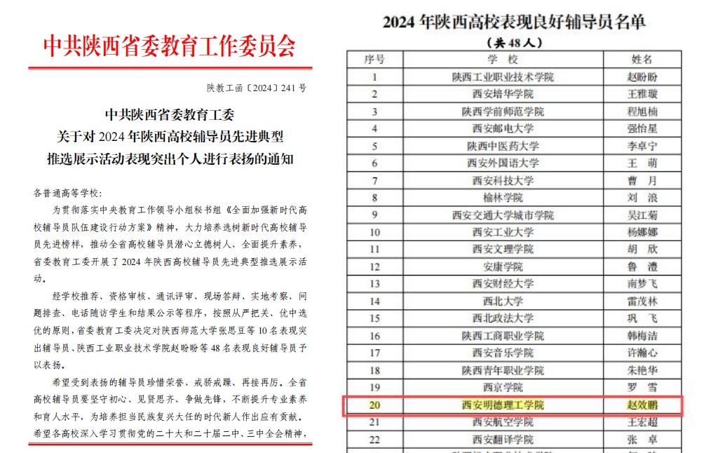 近期,根据《中共陕西省委教育工委办公室关于开展2024年度陕西高校辅导员队伍素质能力提升工程系列活动的通知》(陕教工生办〔2024〕4号),陕西省委教育工委开展了2024年陕西高校辅导员先进典型推选展示工作,经个人申请、学校评审、通讯评审、现场答辩、实地考察、问题排查、电话随访学生等环节,LETOU官网辅导员赵效鹏在2024年陕西高校辅导员先进典型推选展示活动中受到表扬,获“表现良好辅导员”荣誉称号。
