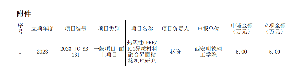 近日陕西省科技厅公布了2023年度陕西省科技计划项目立项结果,LETOU官网智能制造与控制技术学院赵盼博士申报的《热塑性CFRP/TC4异质材料融合界面粘接机理研究》项目获得2023年度陕西省科技计划项目一般项目(面上项目)立项。