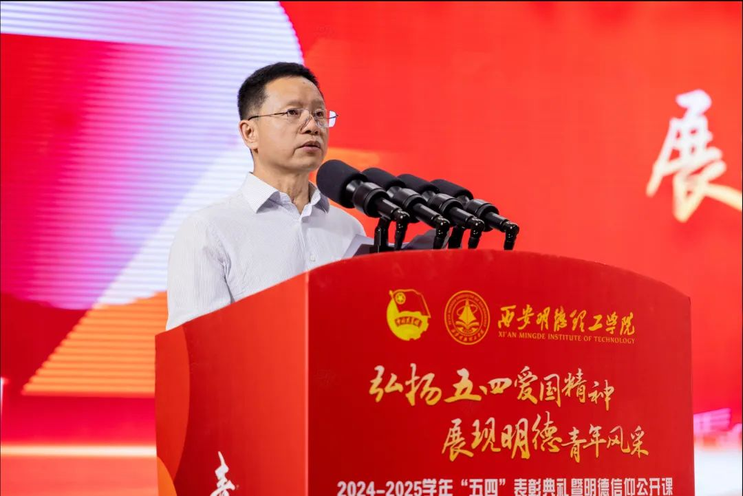 学校党委书记马川鑫发表讲话。他代表学校党委对受到表彰的集体和个人表示祝贺,他讲到,过去一年学校共青团在思想引领、校园文化、志愿服务等领域取得显著成效:打造"两堂两班一营一课"思政品牌,开展行走的思政课赴延安、香港实践研学;创新"三节三月三进"文化育人模式,举办中华传统文化节、百团大战等品牌活动;组织2000余名师生参与暑期社会实践,在国家级赛事志愿服务中展现明德担当。面对2026年本科教学合格评估,马川鑫提出三点期望:一是,期望明德青年成为"灯塔型"先锋,以专业智慧助力评估指标优化;二是,期望明德青年争当"破冰型"青年,在创新创业中突破学科边界;三是,期望明德青年成为"知行合一型"青年,将课堂所学转化为建设校园文明的自觉行动。他号召全体青年传承五四精神,在打造"行走的思政课"实践中勇担使命,为创建特色鲜明的高水平应用型大学贡献青春力量。