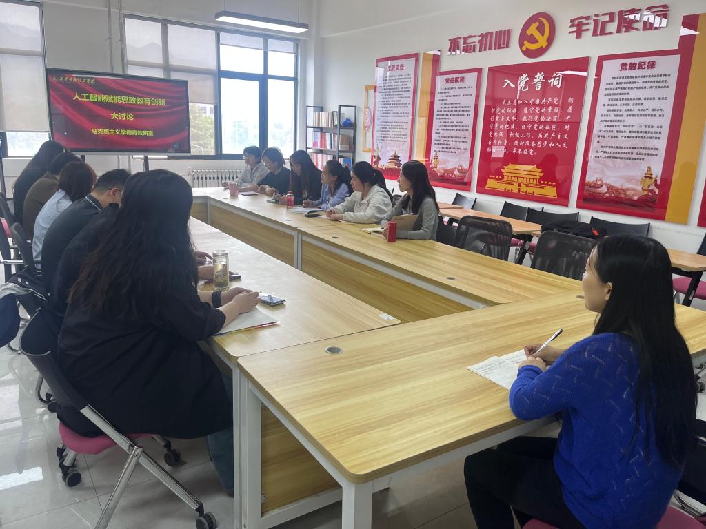 2025年4月15日中午,德育教研室在行政楼南306会议室召开教育思想大讨论专题会议,聚焦“人工智能赋能思政教育创新”核心议题展开深度研讨。会议由教研室主任樊静主持,杨帆老师作主题发言,全体教师围绕AI技术与思政教育的融合路径积极建言献策,共谋新时代思政课创新发展蓝图。
