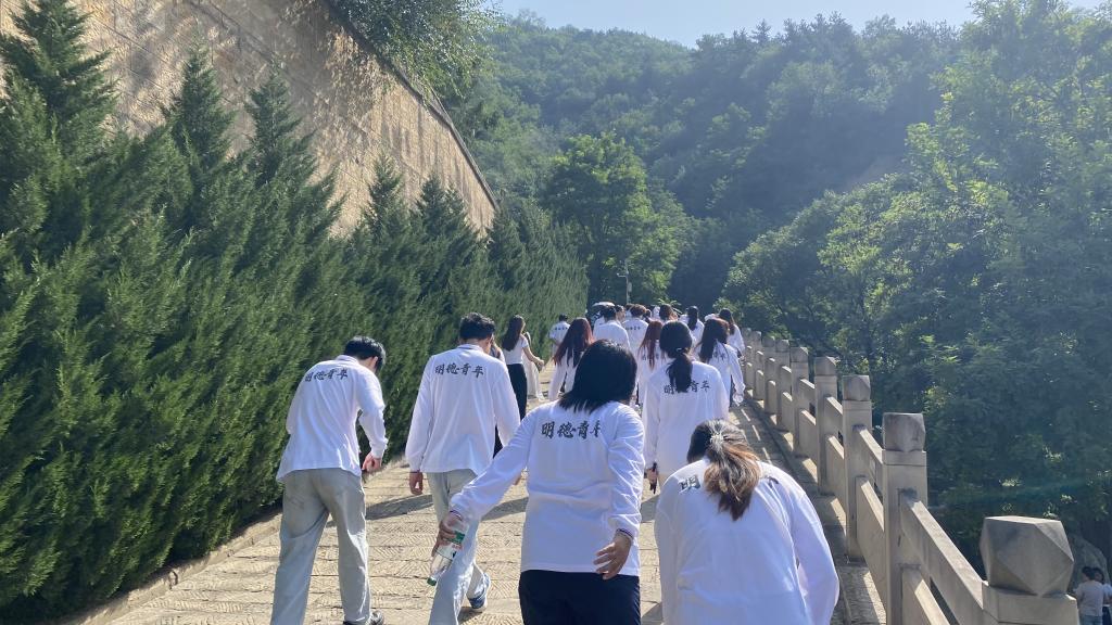 随后,师生们来到宝塔山脚下,开展 “双手搂定宝塔山:徒步登上宝塔山,向革命圣地致敬” 活动。宝塔山是延安的标志性建筑,更是革命圣地的精神象征。师生们沿着石阶拾级而上,尽管山路陡峭,却无人退缩。登上山顶,延安城全貌尽收眼底,延河水蜿蜒如带,革命旧址星罗棋布,现代楼宇与红色遗址交相辉映。宝塔山见证了延安的革命历史,更要见证新时代青年的奋斗。学生要把延安精神化成自我学习的动力,让延安精神在新时代发光。”