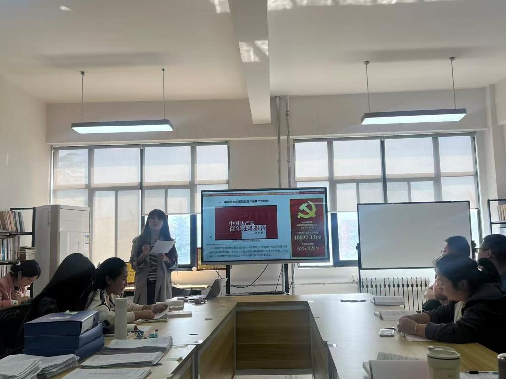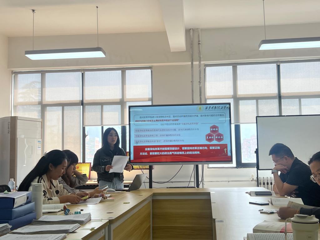 本次集体备课会共有两个主要环节。首先,徐佳晨、赵昕、宏莹三名青年教师分别进行了磨课展示。他们各自选取了教材中的重难点内容,其中徐佳晨老师选取了第3章“坚持党的全面领导”,赵昕老师聚焦第4章“坚持以人民为中心”,宏莹老师则围绕第5章“全面深化改革”展开。三位老师均进行了约15分钟的精彩讲解,他们精心准备,运用多种教学方法和案例,深入浅出地剖析了各章节相关的重难点知识,展现了扎实的教学基本功和对课程内容的深入理解。