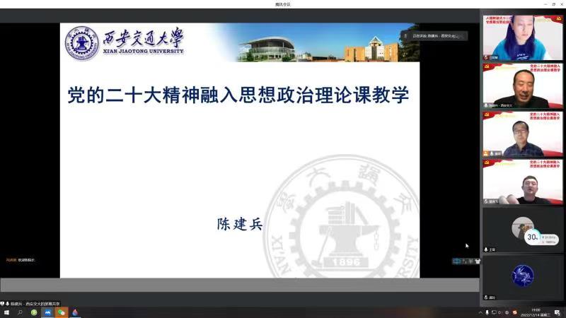 为深入学习贯彻党的二十大精神、扎实推进习近平新时代中国特色社会主义思想和党的二十大精神“三进”工作。12月14日晚,学校邀请西安交通大学陈建兵教授作了题为“党的二十大精神融入思想政治理论课教学”的线上讲座。马克思主义学院全体教师参加了此次讲座,会议由思政教研室主任惠斌主持。
