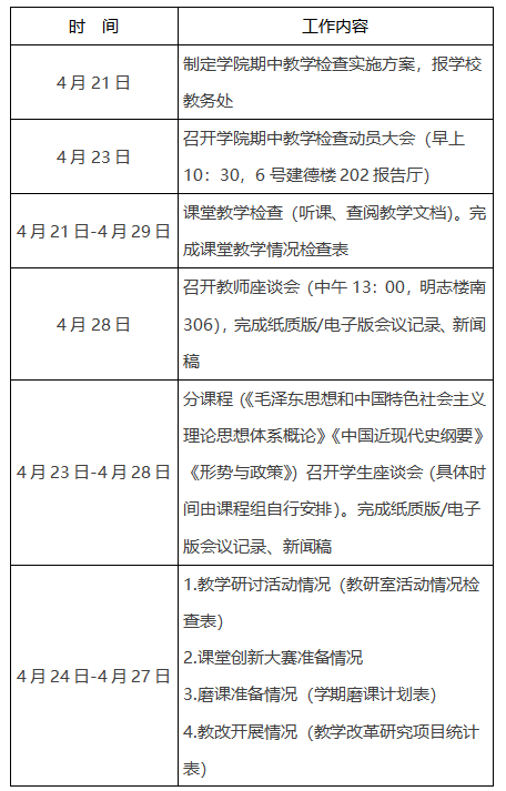 根据学校《关于开展2024-2025学年第二学期期中教学检查工作的通知》(校教字〔2025〕18号)要求,全面了解学院教学运行情况,及时发现教学过程中存在的问题,强化教学质量监控,规范教学管理,推动教师改进教学方法与手段,加强教风学风建设,进一步提升马克思主义理论课程教学质量,切实做好本学期期中教学检查工作,结合我院实际特制定本实施方案。