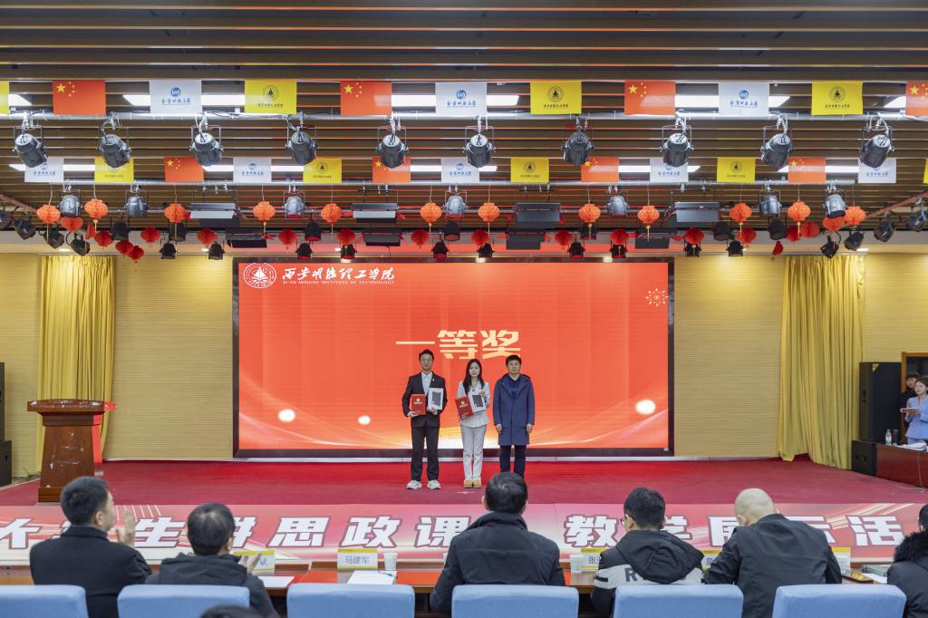 西安邮电大学马克思主义学院副院长马建军为获得一等奖的同学颁发荣誉证书和奖品