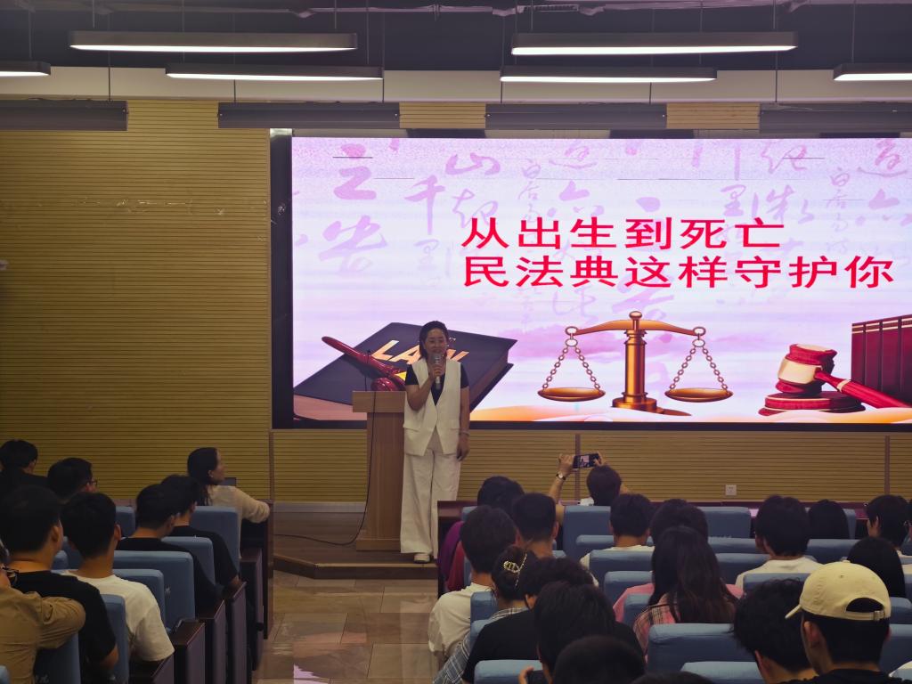 周四下半场活动中,张啭啭老师以“从出生到死亡民法典这样守护你”为主题,系统解读了民法典7编1260条的体系架构,通过典型案例展示其在公民全生命周期保护中的重要作用。党淑敏老师以“婚姻法”为主题,聚焦婚姻家庭编,结合实务案例解析婚姻自由原则的现实应用。赵延泽同学则通过“网购丢件”、“健身房纠纷”等案例,生动阐释了合同编中电子合同规则等创新亮点。三位宣讲者深入浅出的讲解,使抽象法条转化为实用指南,获得师生一致好评。