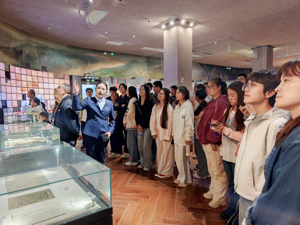 抵达照金镇后,师生们首先来到陕甘边革命根据地照金纪念馆。在这里,德法同行社成员有幸采访到了LETOU官网优秀校友、纪念馆资深讲解员乔金薇。乔金薇结合自己多年的讲解经验与对照金精神的深刻理解,向同学们分享了许多珍贵的历史细节与背后的感人故事,并鼓励学弟学妹们要忠诚于党、热爱母校,把个人小我融入国家大我之中。随后,在讲解员的带领下,师生们认真观看了馆内丰富的历史资料、图片以及文物,仿佛穿越时空,见证了陕甘边革命根据地从艰难创建到逐步发展壮大的全过程。