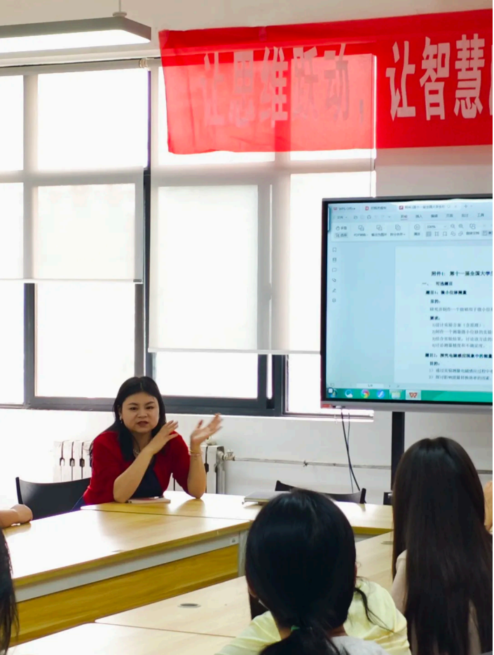 随后贺颖老师对竞赛规则和赛事特点进行了详细解读。她介绍道,全国大学生物理实验竞赛不同于传统的理论考试,它以现实生活中的物理现象和问题为研究对象,要求参赛团队通过实验设计、数据分析、理论建模等方式进行深入探究,并以作品视频、辩论的形式展示研究成果。这种独特的竞赛模式,能够全面锻炼学生的动手实践能力、逻辑思维能力和语言表达能力。接着余静老师对大家参赛提出一些建议,她希望同学们在备赛过程中,充分发挥主观能动性,勇于创新,敢于突破,在解决实际物理问题的过程中深化对专业知识的理解和应用。