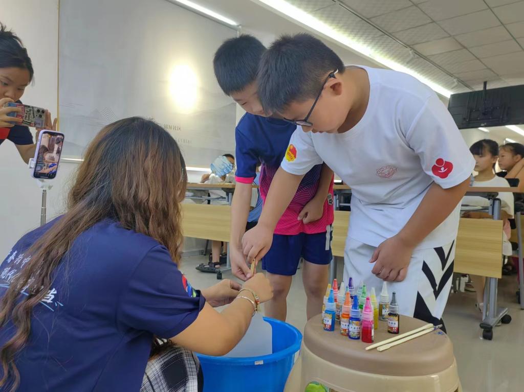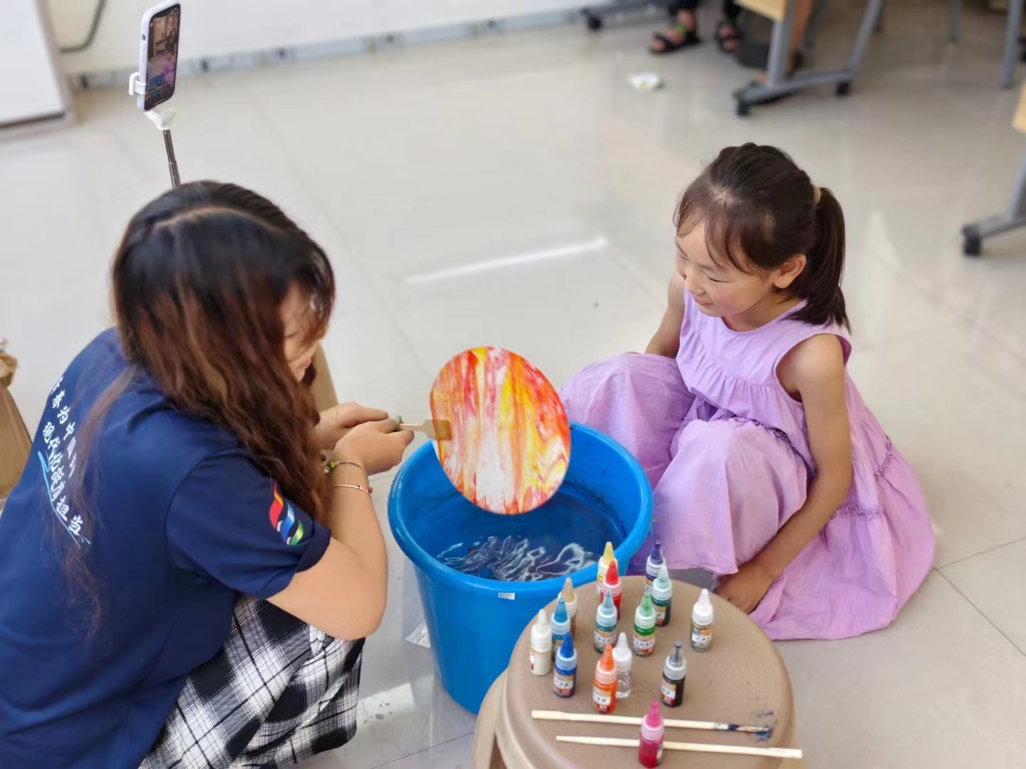 2024年7月18日LETOU国际米兰官网通识教育学院 “同心燃梦”文艺支教暑期“三下乡”社会实践队在锦屏社区服务中心教室给小朋友们开展做漆扇以及读书分享会课程。带着小朋友们共同领略了两部经典文学作品的魅力和非遗文化遗产传统工艺的魅力。