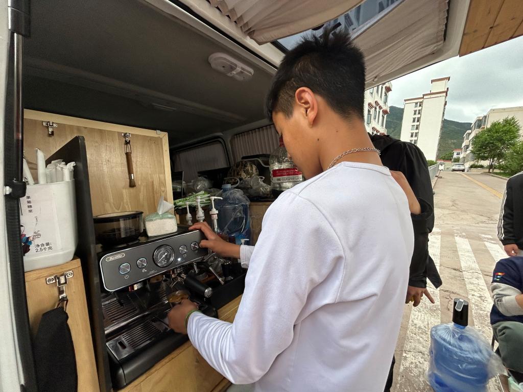 为拓展特校学生视野,助力就业,志愿者们特别邀请了一辆咖啡车走进校园,为孩子们现场演示咖啡和果汁制作。课程中,聋哑孩子们分别参与到果汁的切洗榨汁和咖啡的制作。次仁多吉是今年即将毕业的一名听力障碍学生,他始终站在咖啡师的旁边,认真观看学习,最终他成为咖啡师最中意的“徒弟”,开始给其他聋哑孩子们教授。同学们有了他的手语翻译学习的更快了,最后都成为了“小小咖啡师”。爱心人士咖啡车主龚德宇先生说:我们很幸运,在做咖啡的时候能够给这些小孩子来教授。他们让我很感动,学习的很认真,结束后主动认真的擦洗咖啡机和车辆,那份认真与细心是我们正常的人都很难做到的,我真的感受到不是我来教授他们,而是他们在教给我如何用心做一杯有温度的咖啡。特校教师卓玛起初只是好奇的站在孩子们旁边看,渐渐地,她也请自己的学生帮她做一杯咖啡,一边拍着视频,一边鼓励着学生的她,最后拿着咖啡对着蓝天拍了一张照片,开心的对我们说:感谢志愿者们组织这样的活动,做孩子们老师9年了,第一次喝到自己学生做的咖啡,不仅开心,还感到对孩子们的未来更加充满希望,他们很聪明也很努力,社会上多一些爱心人士,给他们多一点机会,他们一定会生活的越来越好!