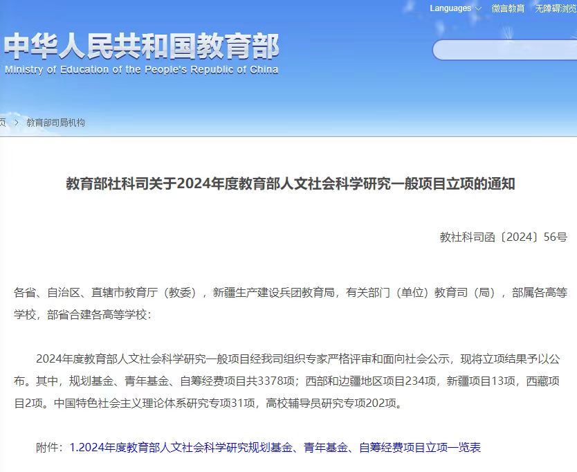教育部人文社会科学研究项目是教育部面向全国普通高等学校设立的人文社会科学研究项目,其覆盖面广、影响大,具有重要的示范和引导作用。该项目围绕贯彻落实习近平总书记关于哲学社会科学工作的重要论述,贯彻落实党中央关于加快构建中国特色哲学社会科学的重大决策部署,充分发挥高校作为我国哲学社会科学“五路大军”中的重要力量作用,不断推进知识创新、理论创新、方法创新,建构中国自主的知识体系,更好回答中国之问、世界之问、人民之问、时代之问,更好彰显中国之路、中国之治、中国之理,助推高校哲学社会科学事业高质量发展。
