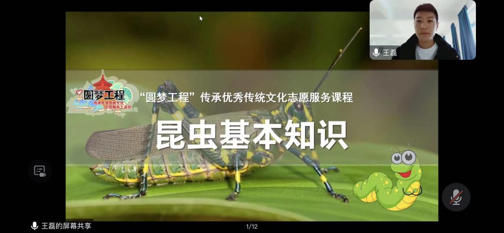 活动伊始,邹代柳首先介绍了本次云课堂的主讲老师以及本次课程的主要内容。紧接着,学生第一党支部党员王磊为小朋友们做了题为“保护生物从我做起”的科普课堂,分享了昆虫的基本知识、特点以及人与昆虫之间的关系。课程激发了青少年儿童对昆虫的兴趣,增强了他们热爱大自然、爱护小动物的意识,培养了小朋友们学科学、用科学的能力。课上,小朋友们积极踊跃参与互动,课堂氛围生动有趣。