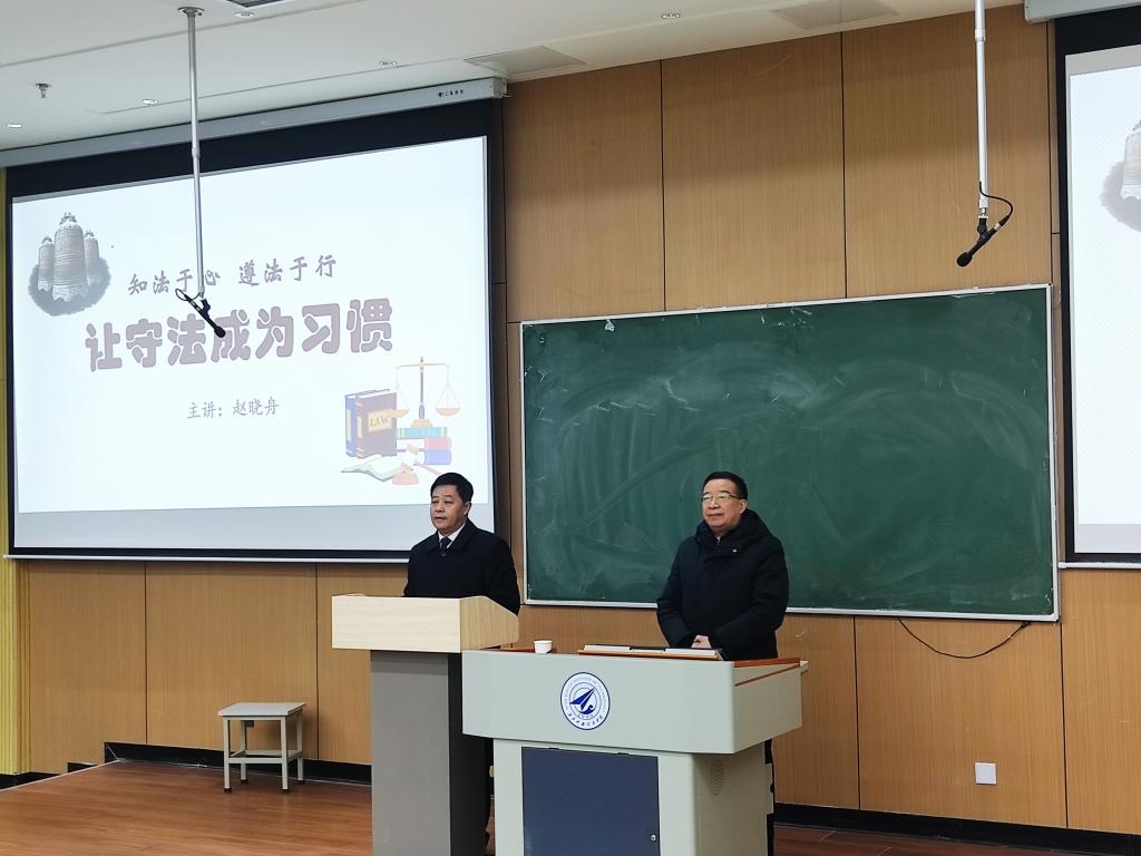期末将至,又值佳节来临,近期已进入电信诈骗高发期。为切实提高学生反诈骗能力,12月27日我院特邀请西北政法大学赵晓舟教授在7号楼102教室为我院师生带来“知法于心、违法于行、让守法成为习惯”的专题讲座。讲座由高等职业技术学院院长舒忠主持。